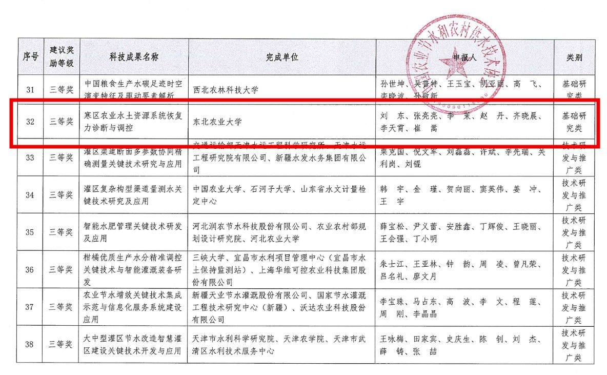农业节水科技奖是经中华人民共和国科学技术部、国家科学技术奖励工作办公室批准,于2009年11月25日设立的全国农业节水和农村供水领域的最高奖项,由中国农业节水和农村供水技术协会承办 。该奖项旨在奖励在农业节水领域的科学研究、技术推广、规划设计和管理决策等方面做出突出贡献的个人或组织对推动我国农业节水和农村供水事业高质量发展发挥了重要作用。中国农业大学、中国水利水电科学研究院、武汉大学、西北农林科技大学等多家单位牵头申报基础研究类奖项,竞争异常激烈,我院能够获奖展示了东农水利在农业节水科技领域的研究实力与影响力。