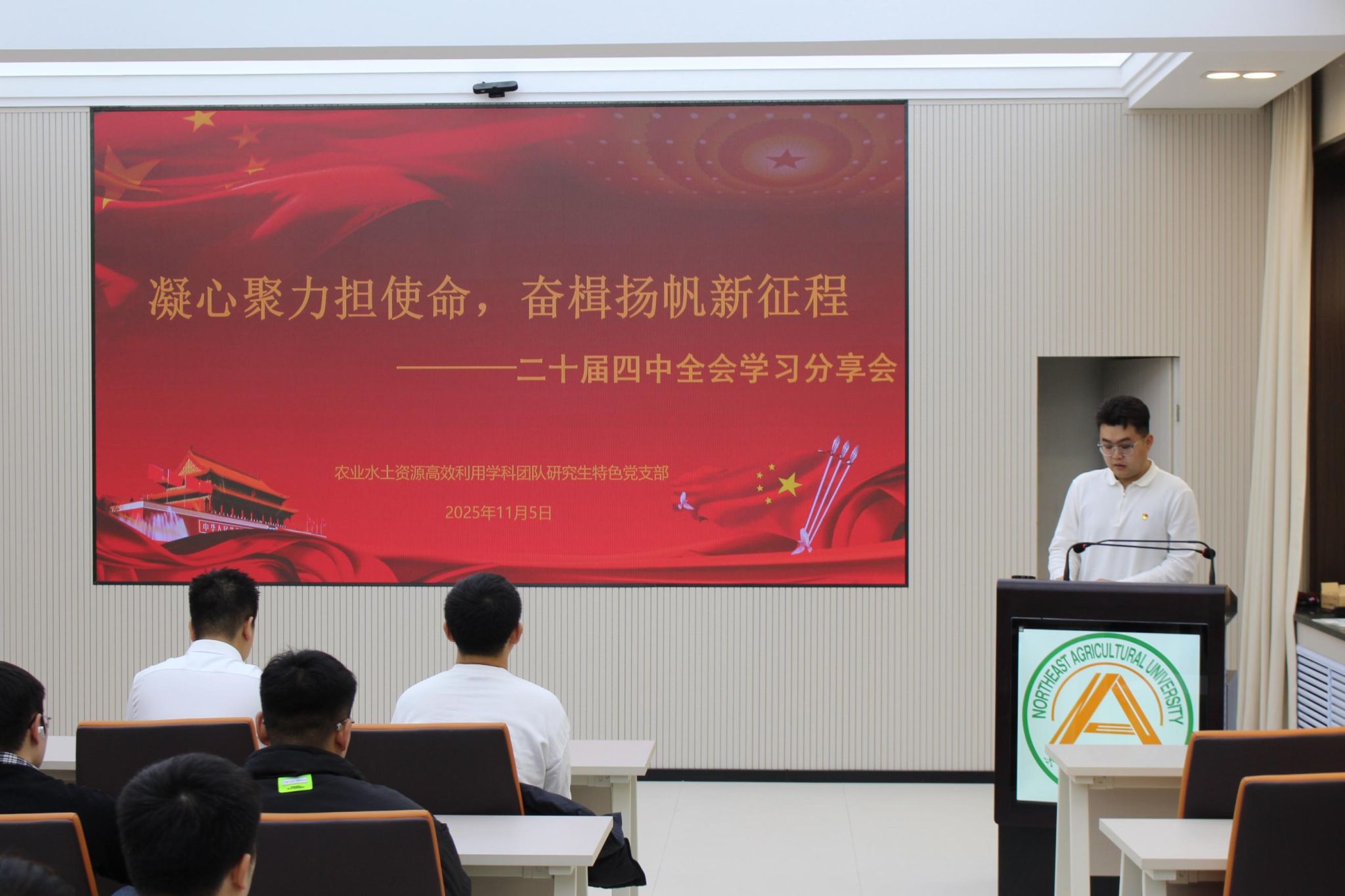 为深入学习领会国家“十五五”规划精神,激发青年党员的时代担当,2025年11月5日,农业水土资源高效利用学科团队研究生特色党支部举办了“凝心聚力担使命,奋楫扬帆新征程”主题学习分享会。水利学院党委副书记王国军、团队导师李天霄及支部全体党员参加活动。活动由党支部书记刘明轩主持。