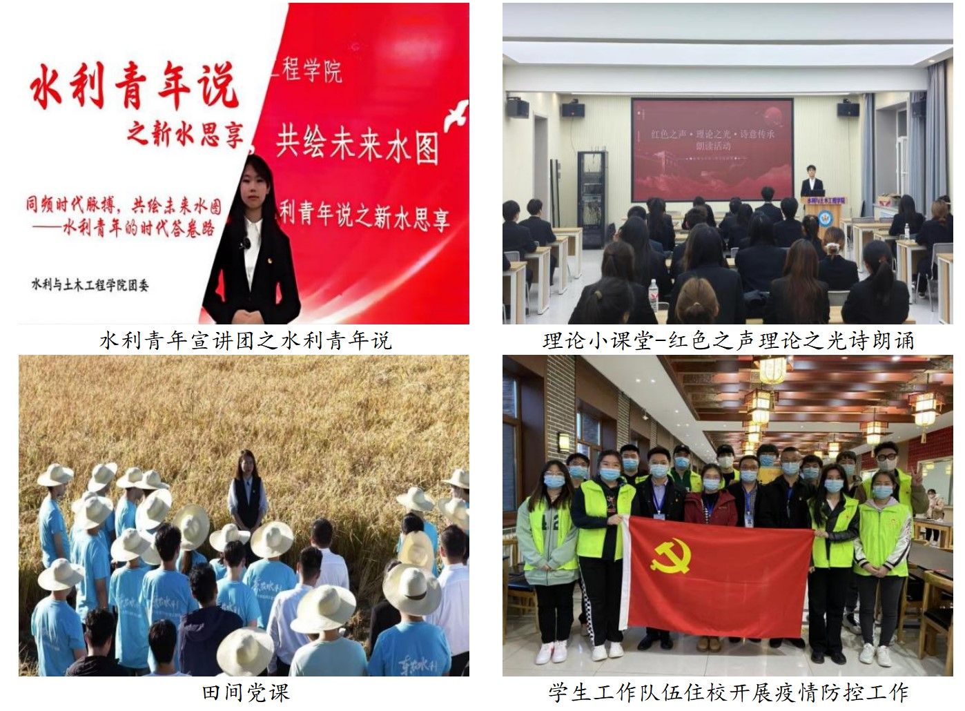 思想引领扎实有效,理想信念根基牢固。组织学生学习党史、党的二十大精神等专题学习300余场,实现党团组织全覆盖。2023年起“青年大学习”网上主题团课参与率长期保持100%。创新打造“水利青年宣讲团”、“理论学习小课堂”,开展“永远跟党走”音乐党史、“云参观红色展馆”、“田间党课”、“行走的思政课”等特色活动150余场。学院新媒体年均推送理论学习文章超2000篇。疫情防控期间,政工队伍住校奋战,组织核酸、排查管控、心理疏导,发布专项推送120余篇,精准服务隔离学生近30名,确保了思想稳定与人文关怀。