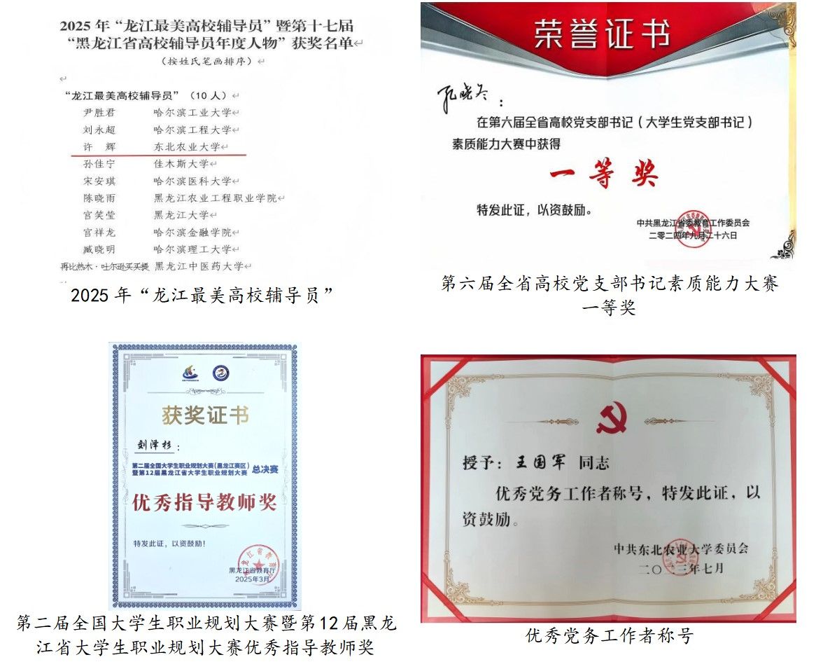 工作队伍专业提升,育人能力显著增强。高度重视辅导员队伍建设,五年新增辅导员办公及工作室4间,工作条件显著改善。搭建“六分仪”“知点生涯”“润泽耘梦”辅导员工作室,其中“六分仪”获批黑龙江省高校辅导员名师工作室。组织辅导员参加培训超100人次,持证上岗率达81.82%。荣获“黑龙江省高等教育教学成果奖特等奖”、全国大学生“三下乡”社会实践活动优秀个人、“黑龙江省最美辅导员”“黑龙江省党支部书记素质能力大赛一等奖”等省部级及以上荣誉8项;涌现校“优秀共产党员”“优秀党务工作者”“校优秀教师”“就业先进个人”“辅导员年度人物”等先优代表16人次;政工队伍主持教育部、校级课题近10项,发表论文20余篇,专业化、职业化水平显著提升。