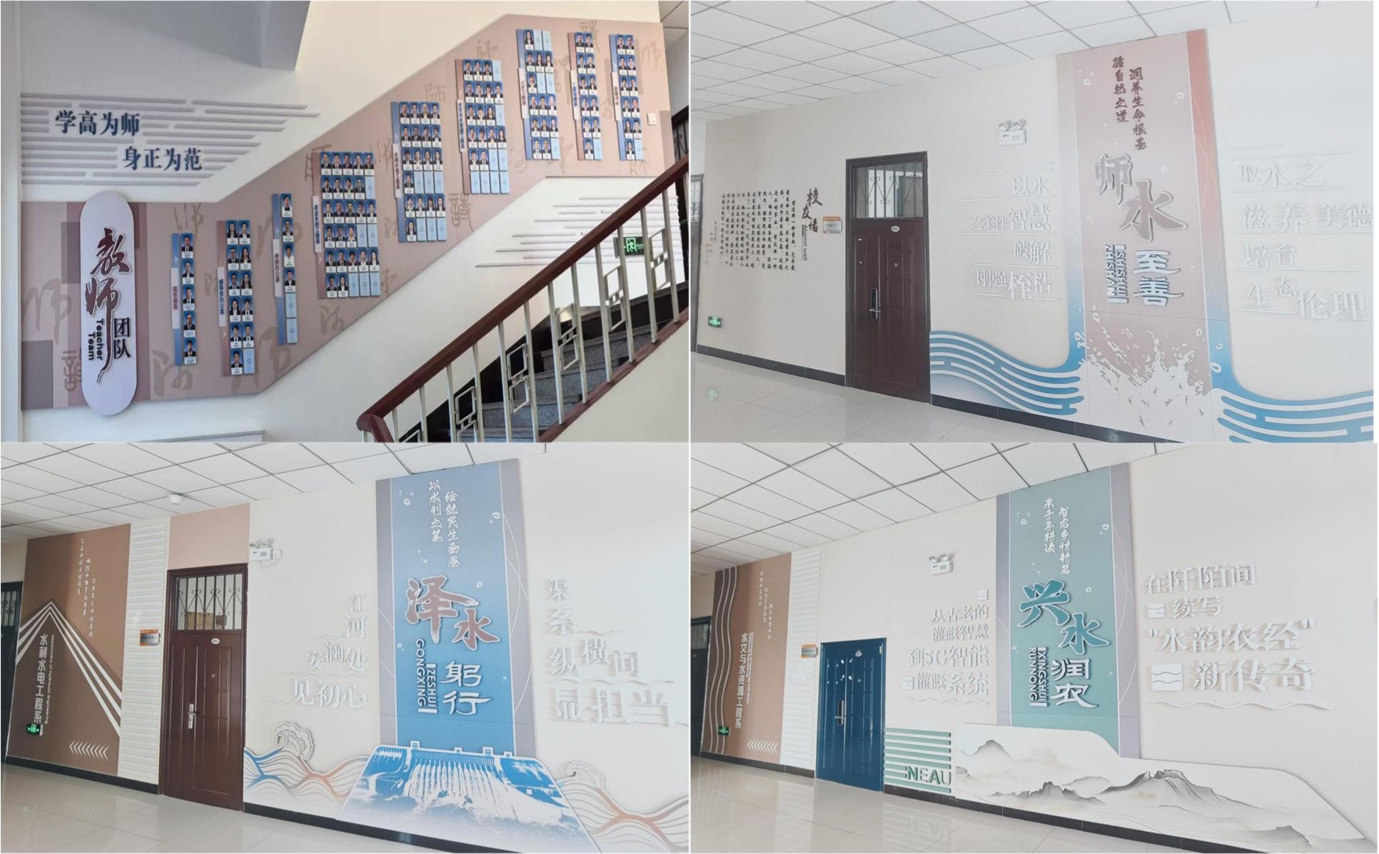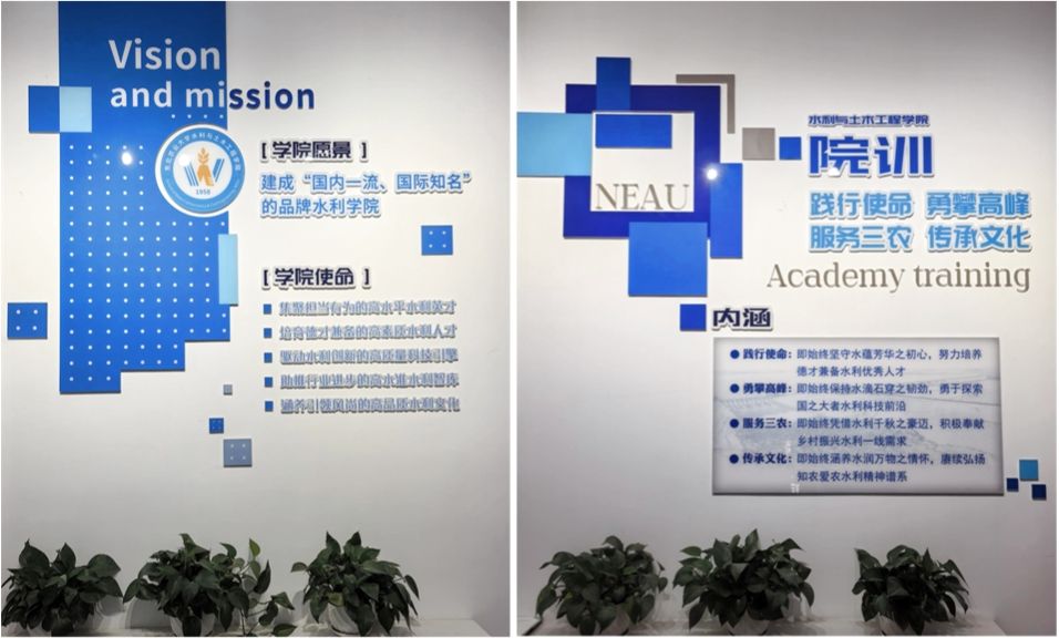 环境润心,营造育人场域。学院注重以环境建设为载体,将“水文化”与学院精神具象化,打造浸润式育人空间。在实体文化墙建设上塑造可视载体,以“水”为精神主线,系统打造系列主题文化墙,营造可视化、可感知的育人氛围。在水利楼走廊设立校友文化长廊,不仅集中展示历届毕业生合影,更通过学院建设脉络、学科优势、人才成果、科研教学成就等模块,全景呈现学院发展轨迹与突出贡献,使其成为校友追溯记忆、学子汲取动力的文化窗口;同时融入新中国水利光辉历程与新时代水利精神的阐述,进一步强化价值引领。在新空间文化植入上融入人文内涵,在近3000平方米新实验大楼的搬迁与建设过程中,同步推进文化元素植入规划,将学院精神、学科特色、重大成果等深度融入空间设计与视觉呈现,实现环境育人与实践功能的高度统一,使新空间不仅满足教学科研需求,亦成为持续传递学院文化、浸润师生思想的重要场所。