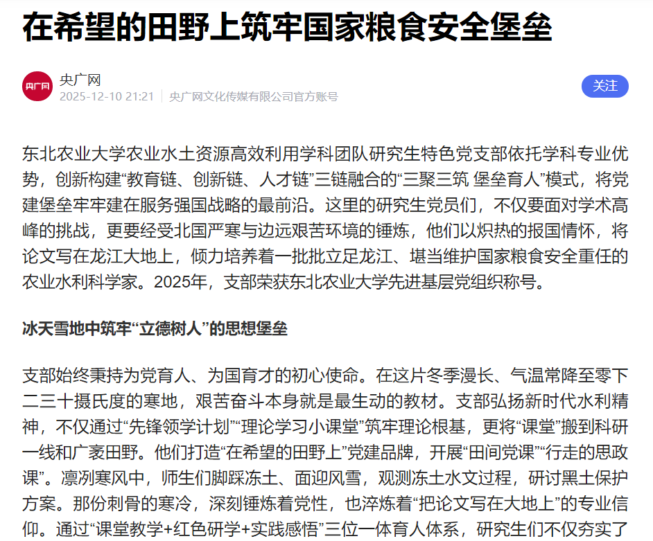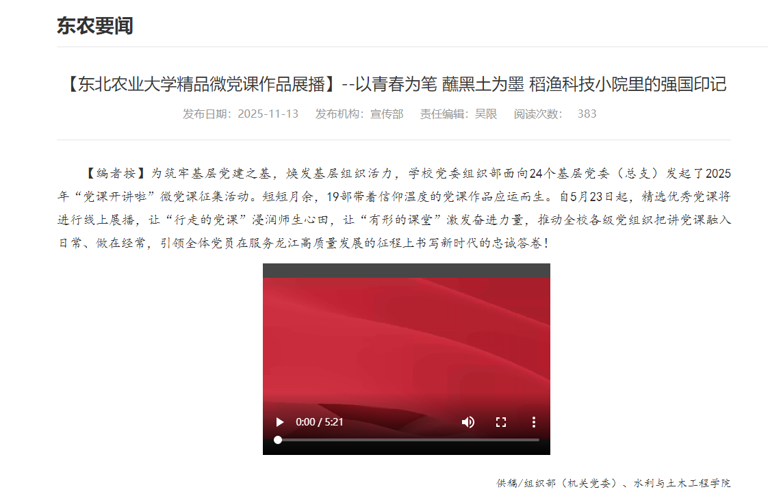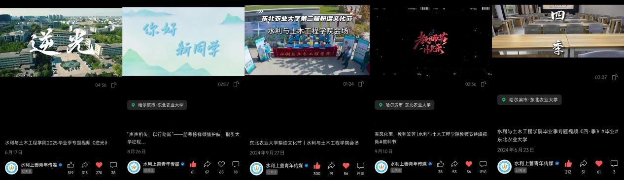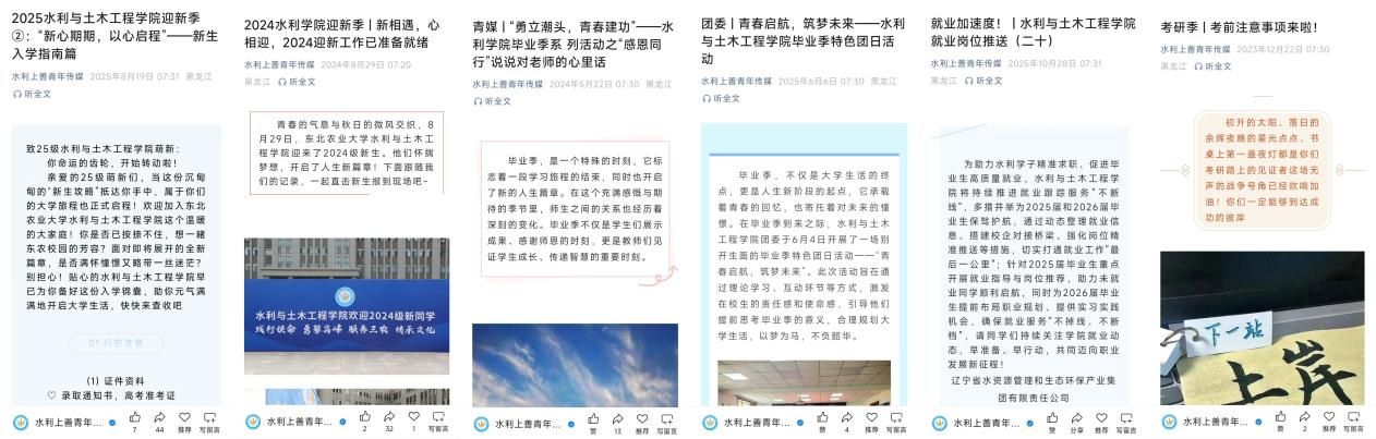 传播聚力,提升品牌影响。学院构建立体化传播矩阵,以数字赋能文化传播,持续扩大学院文化辐射力与社会声誉。拓展平台矩阵,以学院官网为核心,联动“水利上善青年传媒”微信公众号、官方抖音号等新媒体平台,构建覆盖广泛、形式多样的传播载体,持续扩大文化传播的渗透面与受众群。打造精品内容,围绕学院中心工作年均推出系列高质量宣传作品,“水稻田里上党课”等微党课校内展播,“在希望的田野上筑牢国家粮食安全堡垒”获央广网、黑龙江网等主流媒体推荐。提升外宣声量,科技小院建设、学生竞赛成果等获多家媒体专题报道,在持续输出特色文化内容的同时,也在更广阔的传播空间中塑造了积极、专业的学院形象。