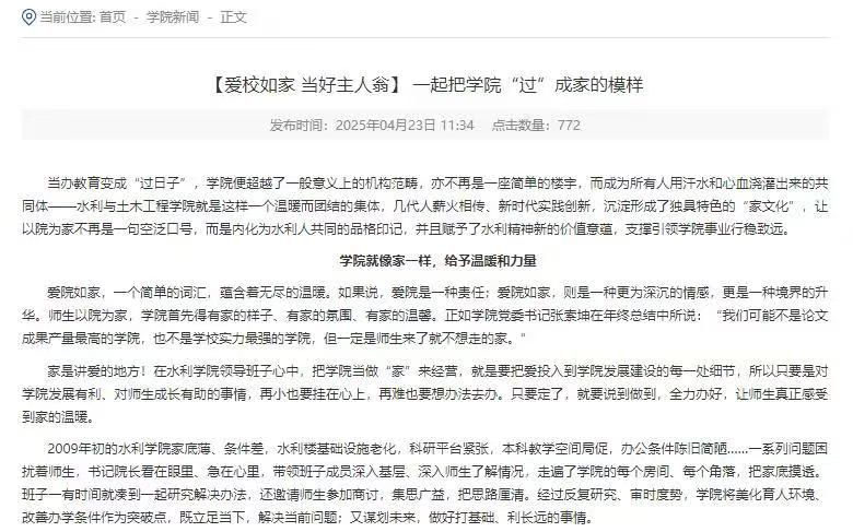 精神凝心,筑牢价值认同。学院以精神文化凝练为中心,着力打造具有水利特色的文化符号,凝聚师生共同价值追求。践行院训精神,确立“践行使命、勇攀高峰、服务三农、传承文化”为院训,并将其贯穿教育教学全过程,推动师生知行合一。融合精神谱系,系统整合水利行业精神、北大荒精神与东农精神,纳入新生入学教育及党员培养体系,夯实思想根基。强化典型引领,持续开展“爱院如家”系列宣传,杨帆教授获“中国青年五四奖章”,孙楠教授入选“长江学者奖励计划”青年学者,“身边榜样”资源库持续完善,形成见贤思齐的良好氛围。