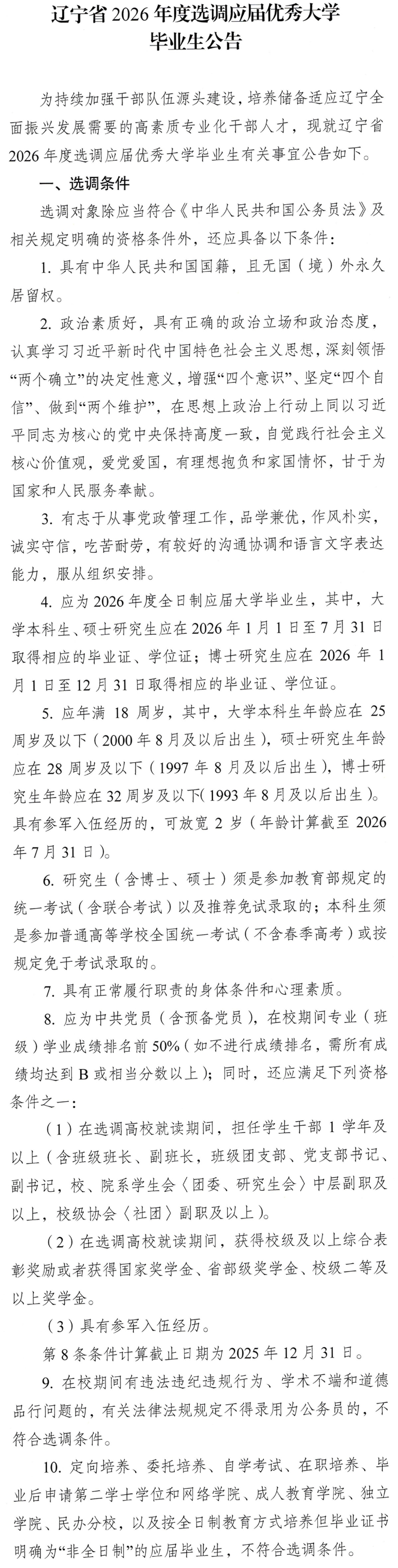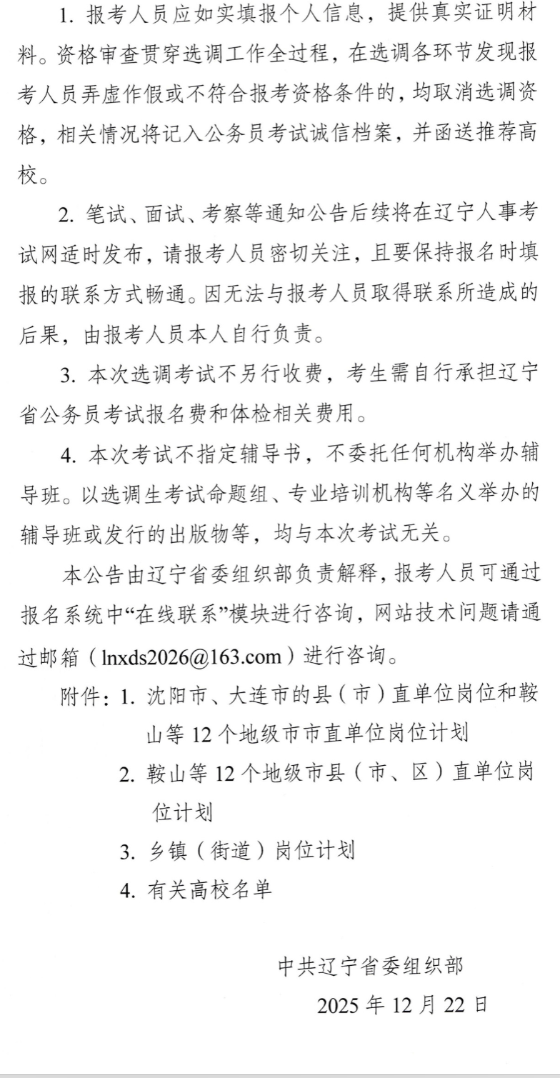 辽宁省2026年度选调应届优秀大学毕业生公告