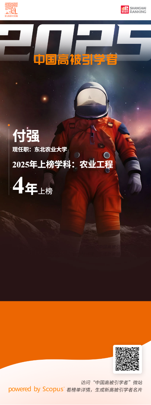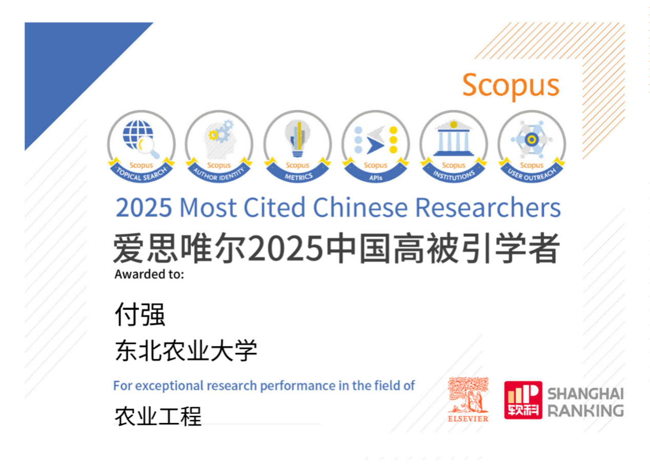 2026年1月30日,爱思唯尔(Elsevier)正式发布2025“中国高被引学者”(Highly Cited Chinese Researchers)榜单。上榜的学者上榜共计6310人,来自543所高校、企业及科研机构,覆盖了教育部10个学科领域、83个一级学科。我院付强教授入选“农业工程”学科“高被引”榜单,这也是付强教授继2022年入围该榜单后,连续四年入选“中国高被引学者”!