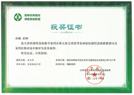 孙楠教授长期专注于水利类专业课程的教学创新与思政融合,深入挖掘专业核心课程蕴含的科学精神、工程伦理与生态智慧,切实增强学生的专业认同感与社会责任感。今后,学院将继续支持教师开展课程思政改革创新,深化与全国高等农林院校课程思政联盟的交流协作,持续推动立德树人根本任务与专业教育深度融合,为培养知农爱农、强农兴农的高素质创新型人才贡献力量。